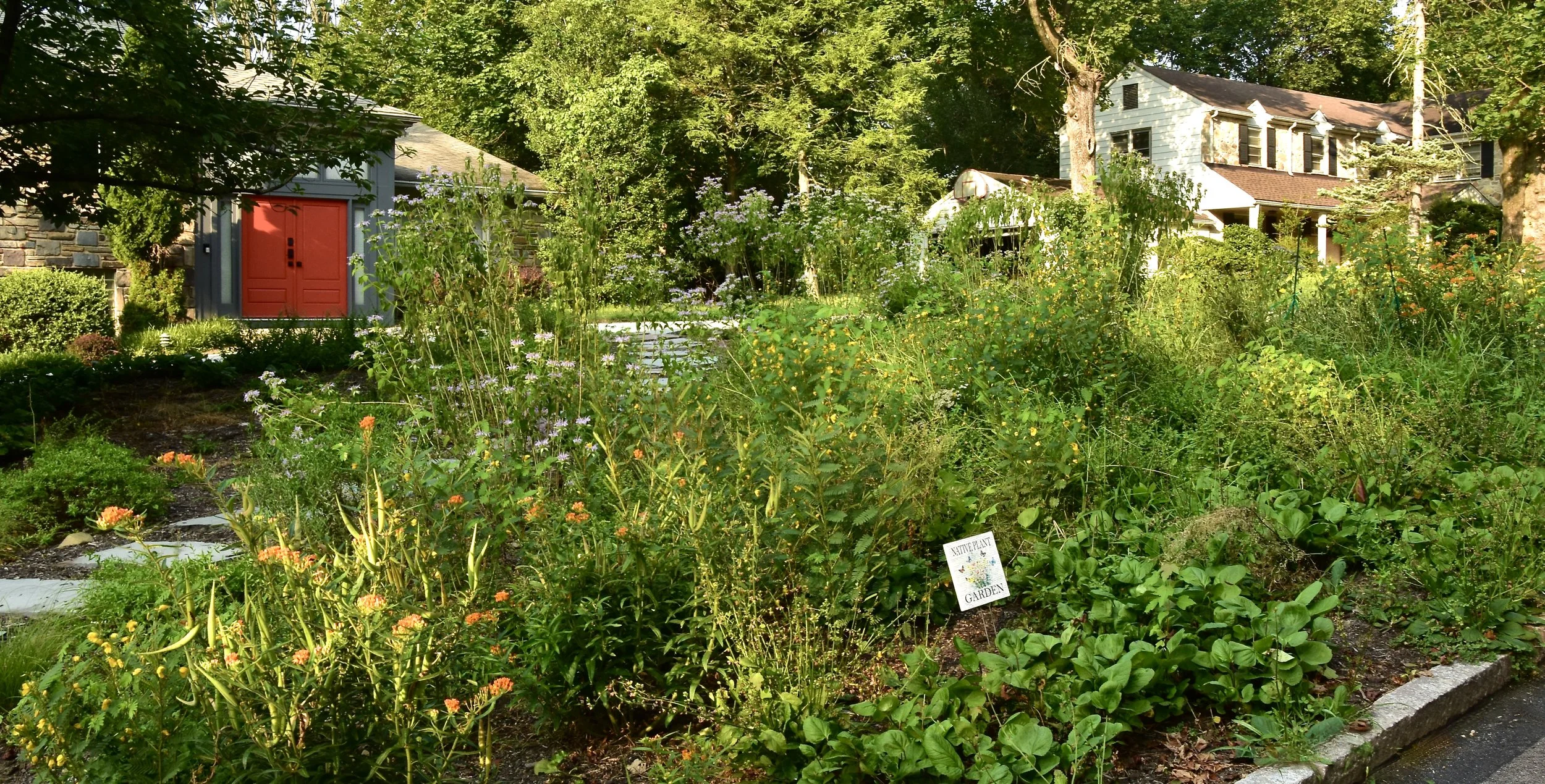 These homeowners wanted to eliminate the lawn in the front yard traffic circle to avoid the need to mow. I designed a deer-resistant, seasonal palette of wildflowers, grasses, and sedges to take its place. The resulting dynamic tapestry elevates the texture and wildlife value of this space as well as fosters conversations with neighbors passing by. In summer, I love the combination of orange milkweed flowers and the fun front door!