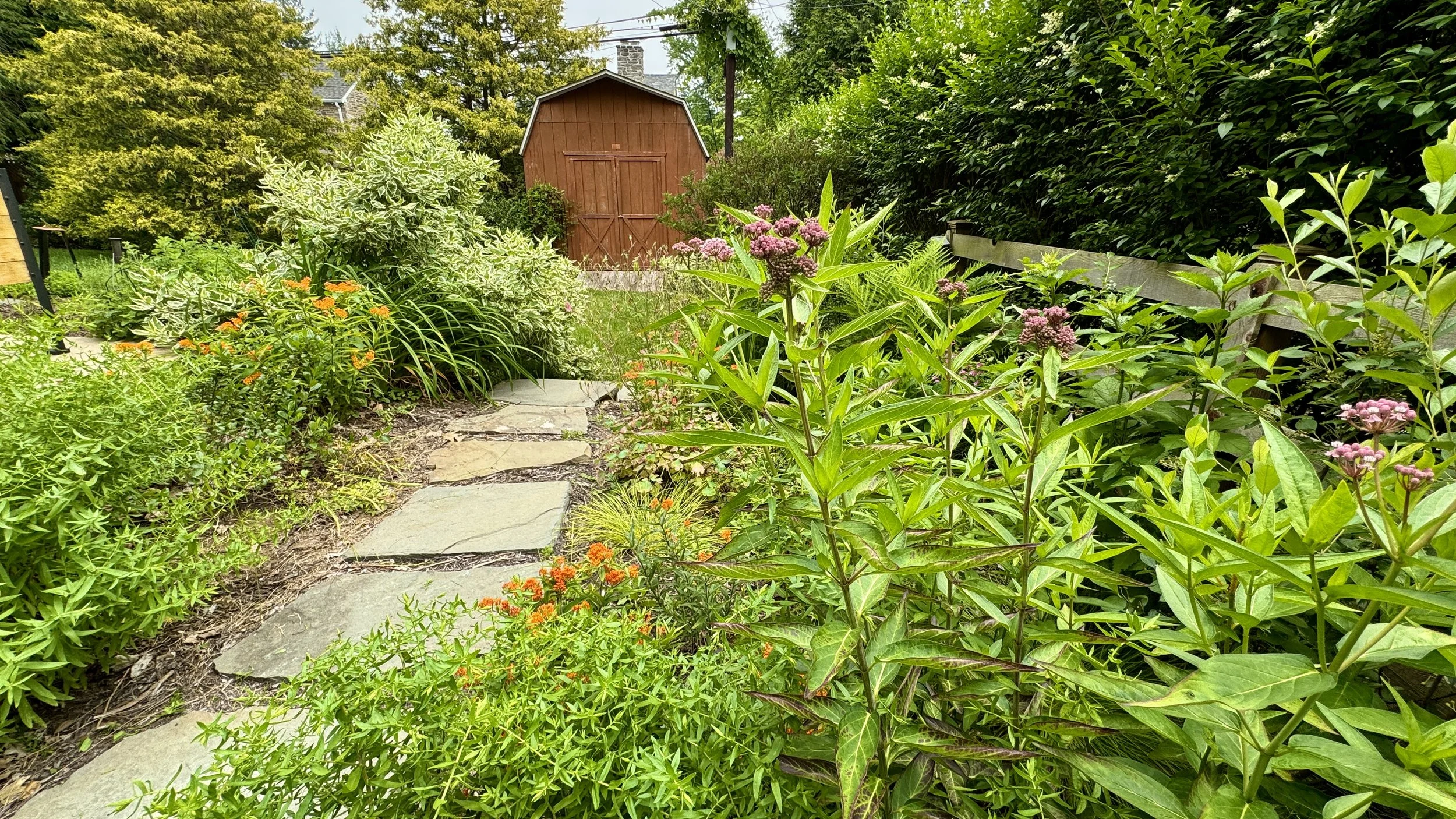 The downhill side of this backyard path to the shed hides a rain garden that captures water from the nearby house roof. Sedges, Eastern columbine, milkweeds, chokeberries, Joe Pye weeds, asters, goldenrods and more grow exuberantly to create lush passage to the backyard where this avid vegetable garden spends lots of time enjoying all aspects of her gardens.